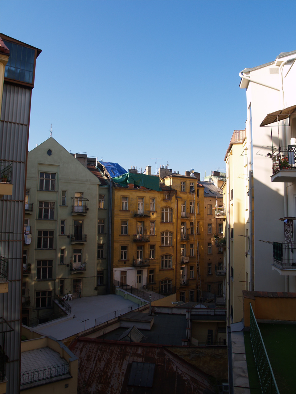 ホステルの建物の窓から覗く中庭