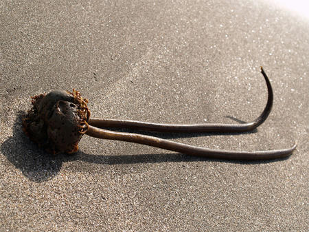 海底にはりついていた海草が根っこごと取れて海岸に打ち上げられたのでしょう。一瞬クラゲかと思いました