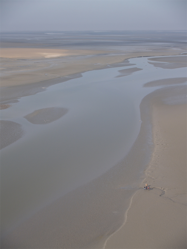 モンサンミッシェルの干潟。果てしなくどこまでもこんな感じの風景が周りいっぱい広がってます。右下に干潟を歩いている人たちがこっそり写ってます