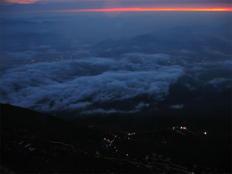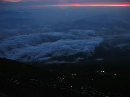 眼下に広がるのは、登山者たちの連なりと山小屋の微かな明かりと地上の明かりと朝焼け